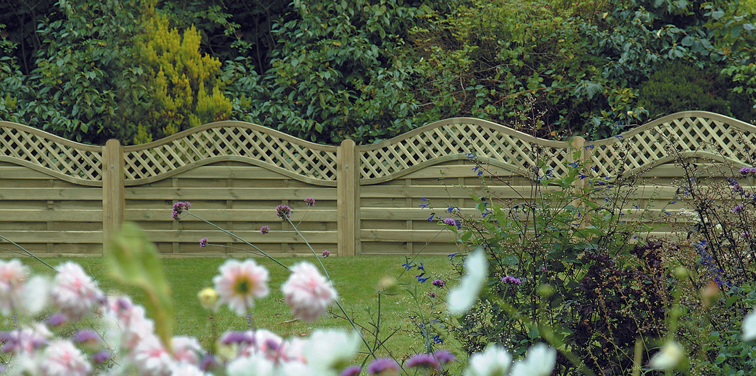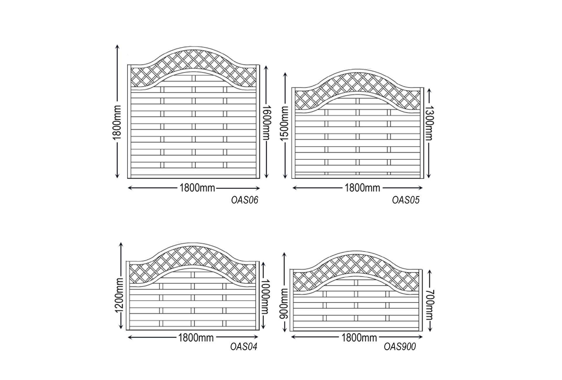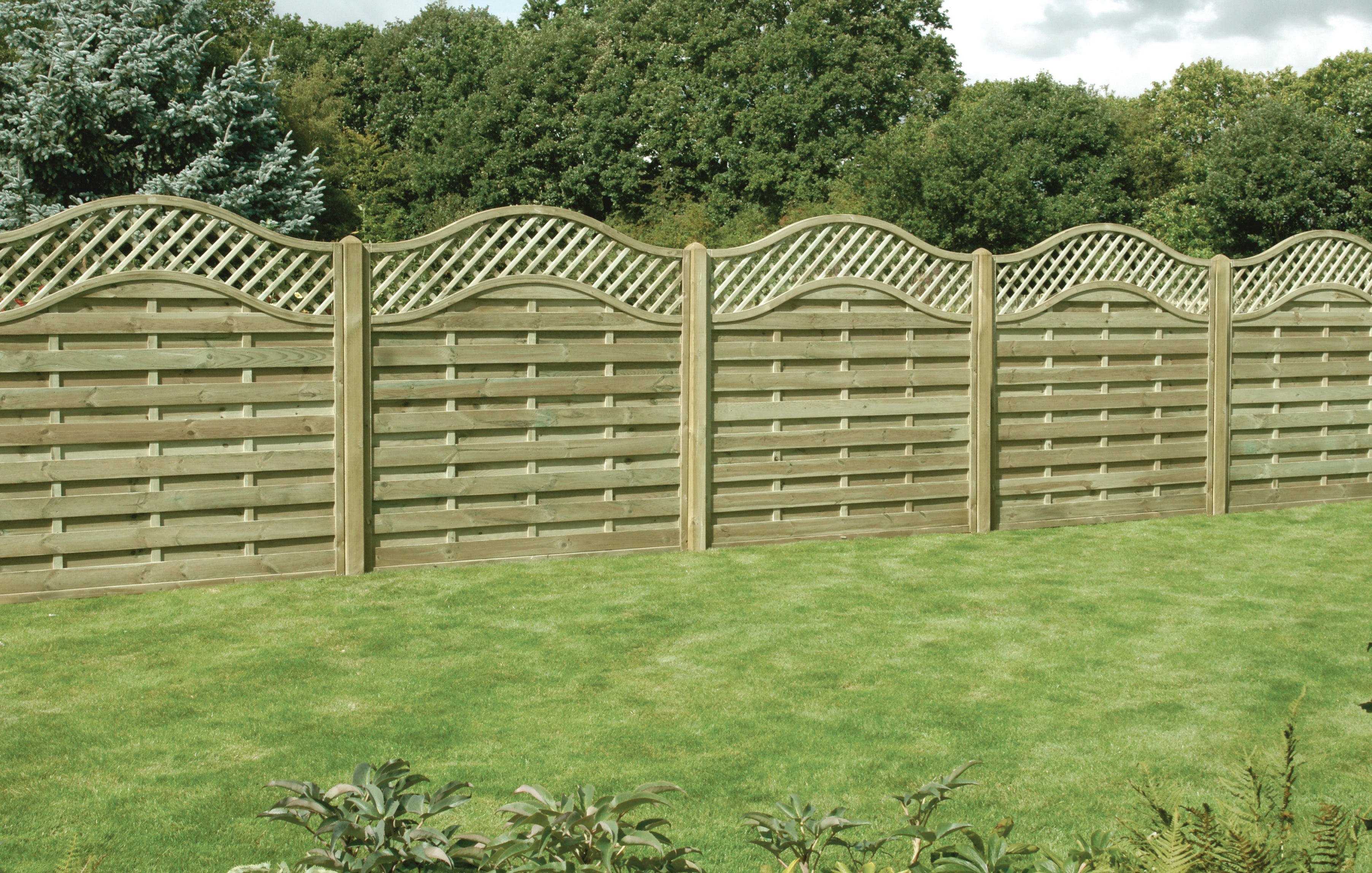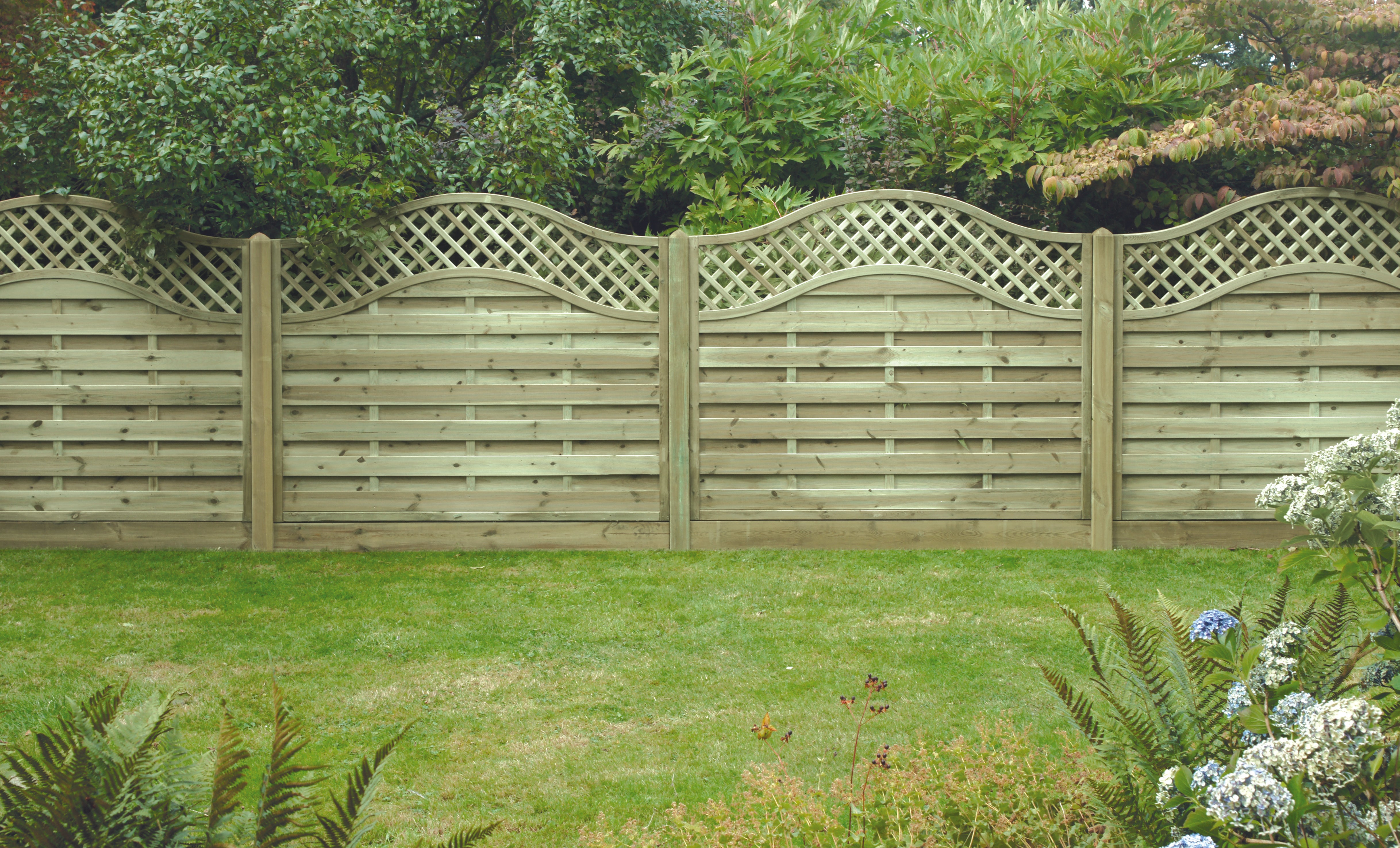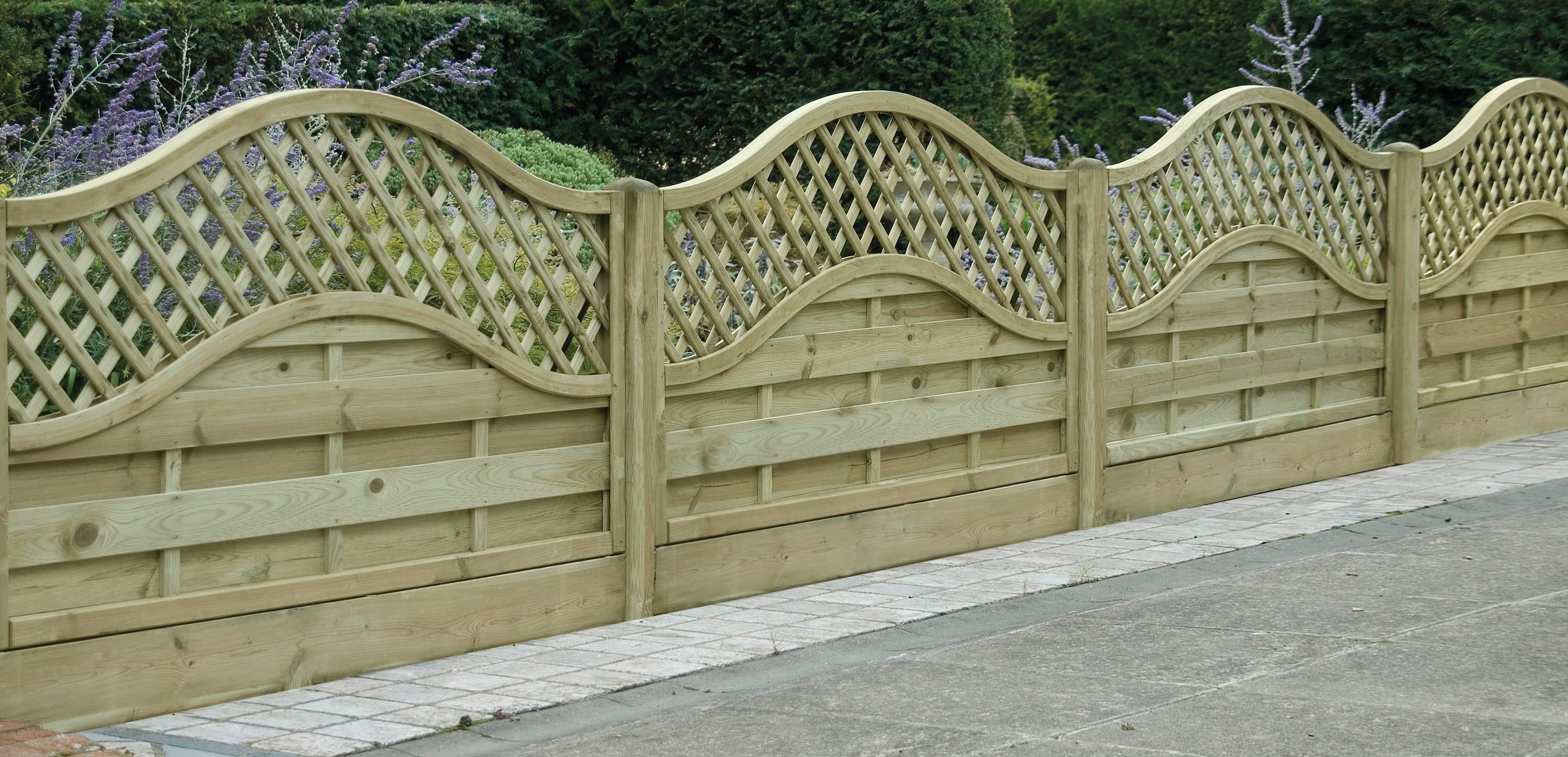 The decorative Chester panel combines a horizontally mounted ribbed overlap board in a staggered pattern and fitted in a high quality rebated frame. The panel is finished with an attractive diamond lattice top section with a wave bow top frame.