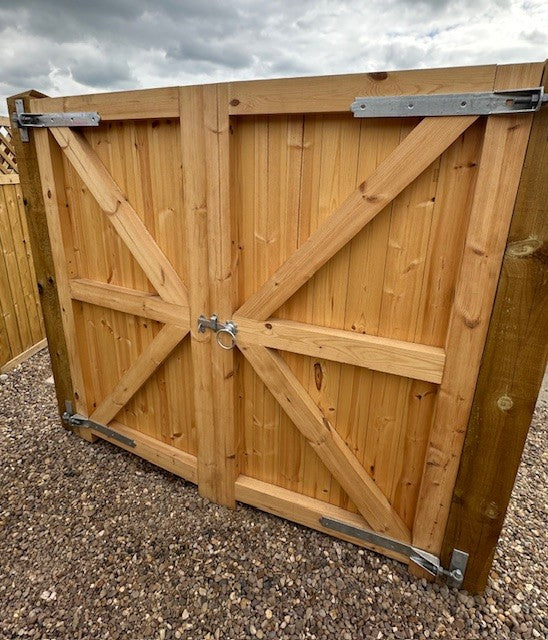 The gates are made with 100mm x 75mm smooth planed framing and 19mm T&G boards (finished at 16mm). Mortice and tenon jointed framework and inset T&G vertical boarding provide a durable gate. K frame bracing on the rear is designed to minimise twisting or sagging over time. Lead time for manufacture is up to 4 weeks.