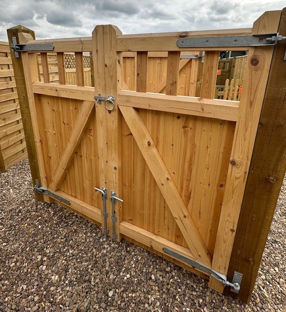 The gates are made with 100mm x 75mm smooth planed framing and 19mm T&G boards (finished at 16mm). Mortice and tenon jointed framework and inset T&G vertical boarding provide a durable gate. K frame bracing on the rear is designed to minimise twisting or sagging over time. Lead time for manufacture is up to 4 weeks.